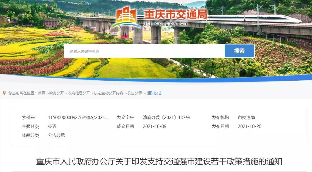 近日,重慶市印發《支持交通強市建設若干政策措施》,文件不僅明確“十四五”期間安排市級財政資金1150億元,統籌用于高速鐵路、高速公路、普通國省干線公路、民航、水運以及支持鄉村振興的農村公路等交通基礎設施建設。