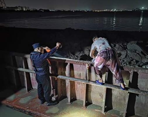 當晚9時50分,由中山市海洋綜合執法支隊支隊長梁灶帶領隊,一眾聯合執法人員從橫門漁港出發開始突擊巡查。當巡查至洪奇瀝沙仔碼頭至屎船沙海域時,發現1艘抓斗式采砂船“粵新會工8179”正在作業。執法人員立即靠近準備登船檢查,該采砂船見執法船艇靠近馬上停止作業并關閉照明設備,意圖逃避查處。執法人員迅速登船查看,發現該采砂船及系泊的“粵清遠貨3390”運泥船泥水濕潤,有明顯的采砂痕跡,運輸船上載有泥沙混合物約200立方米,船上負責人辯稱正在進行航道疏浚,執法人員要求其提供相關資料,該負責人無法提供。